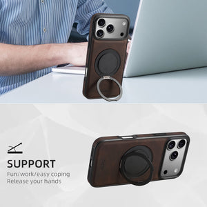 Vintage leather texture with magnetic ring stand, supports horizontal/vertical placement, frees hands. Precise cutouts, full camera protection, blends business style & practicality for work/play.