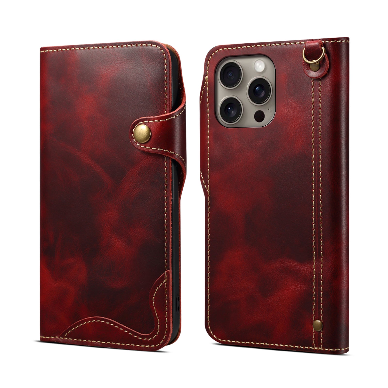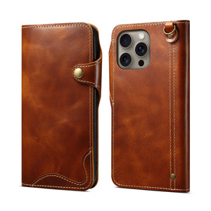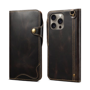Luxury black leather iPhone case compatible with MagSafe, featuring a foldable stand, secure all-around protection, slim and elegant design, precise cutouts, and comfortable grip for daily use.
