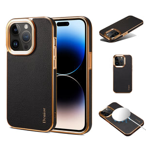 Premium calf-skin leather, electroplated gold frame for luxury. Wireless charging compatible, no need to remove. Slim & portable, full camera protection, precise cutouts, stylish & functional.