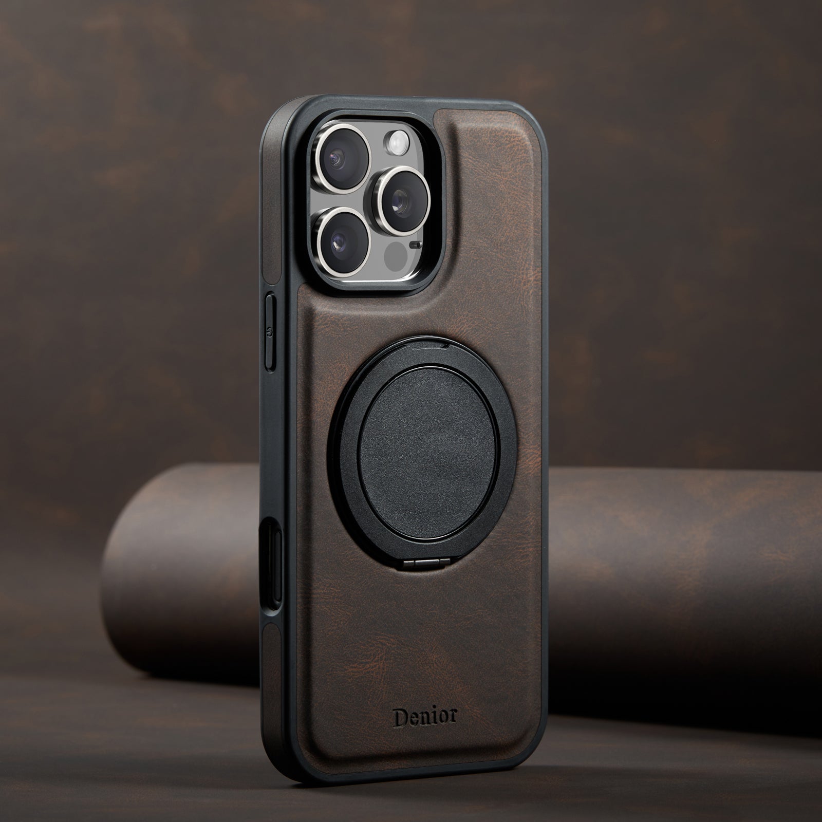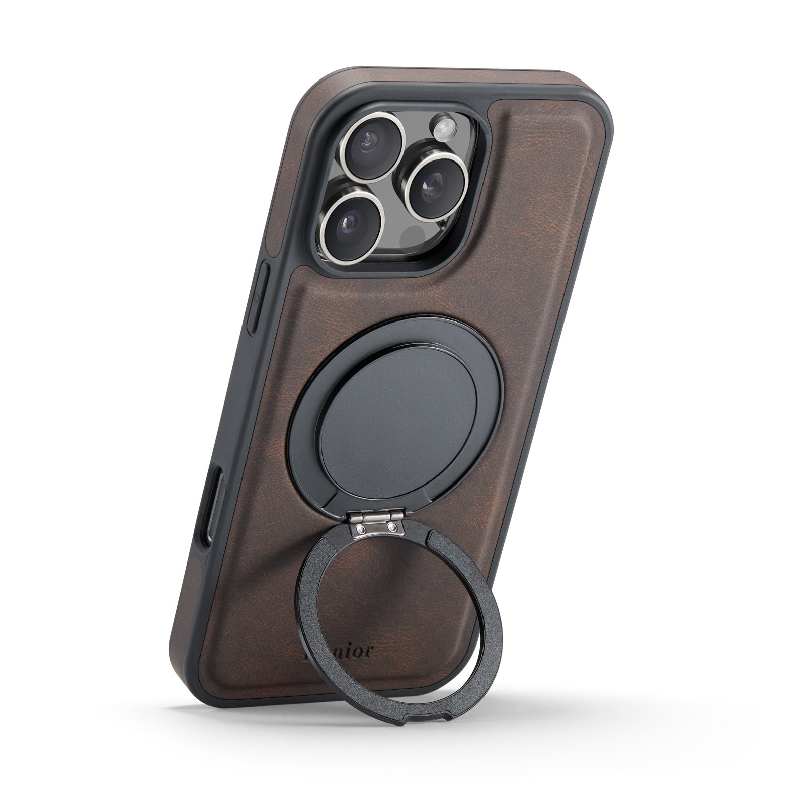 • Dark brown textured case with black frame, foldable metal ring stand for stable support & secure grip. Precise camera cutouts, full protection, modern minimalist design, stylish & practical.
