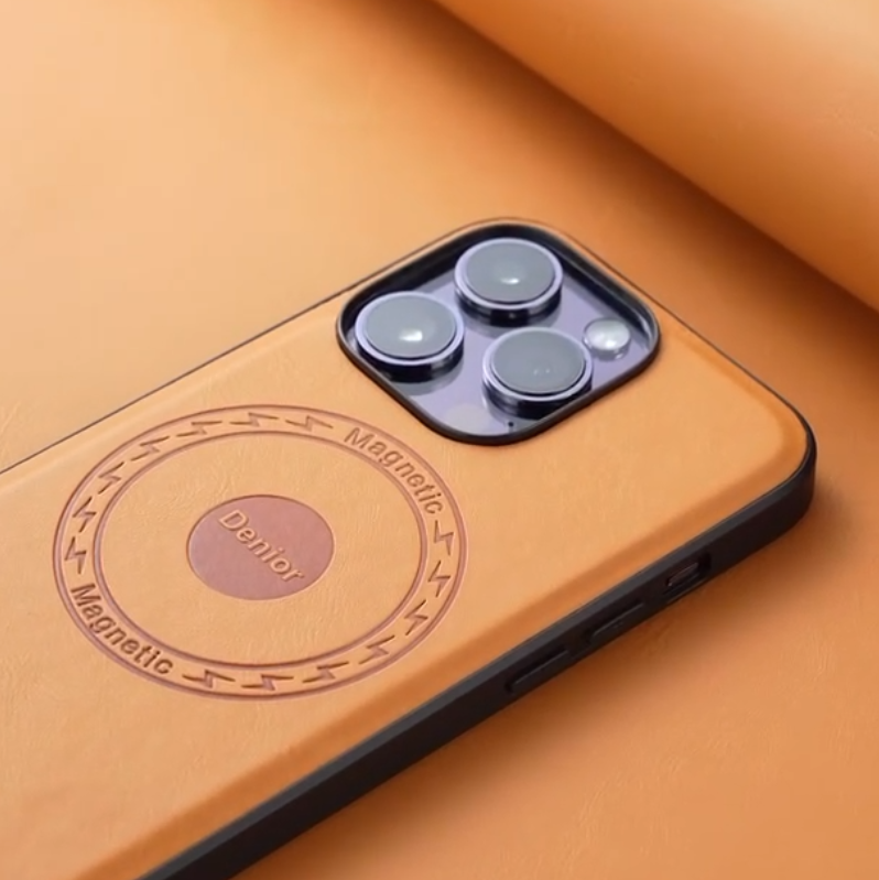 Warm brown leather with smooth touch, embossed magnetic pattern for sleek luxury. Flexible black edge, snug fit, precise camera coverage, scratch-resistant, stylish & protective for daily use.