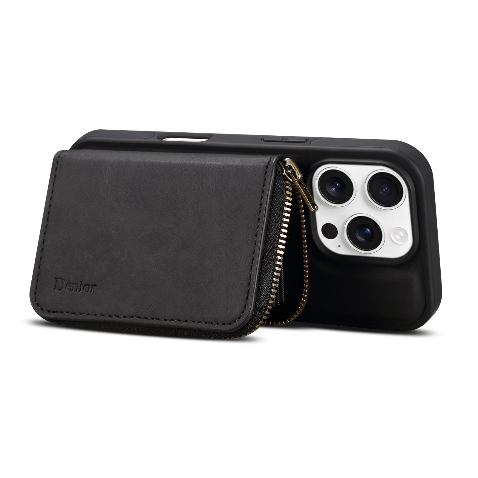 Black leather encases your iPhone, with card slots, foldable magnetic stand, full protection, and a sleek, sophisticated design for daily use or gifting.