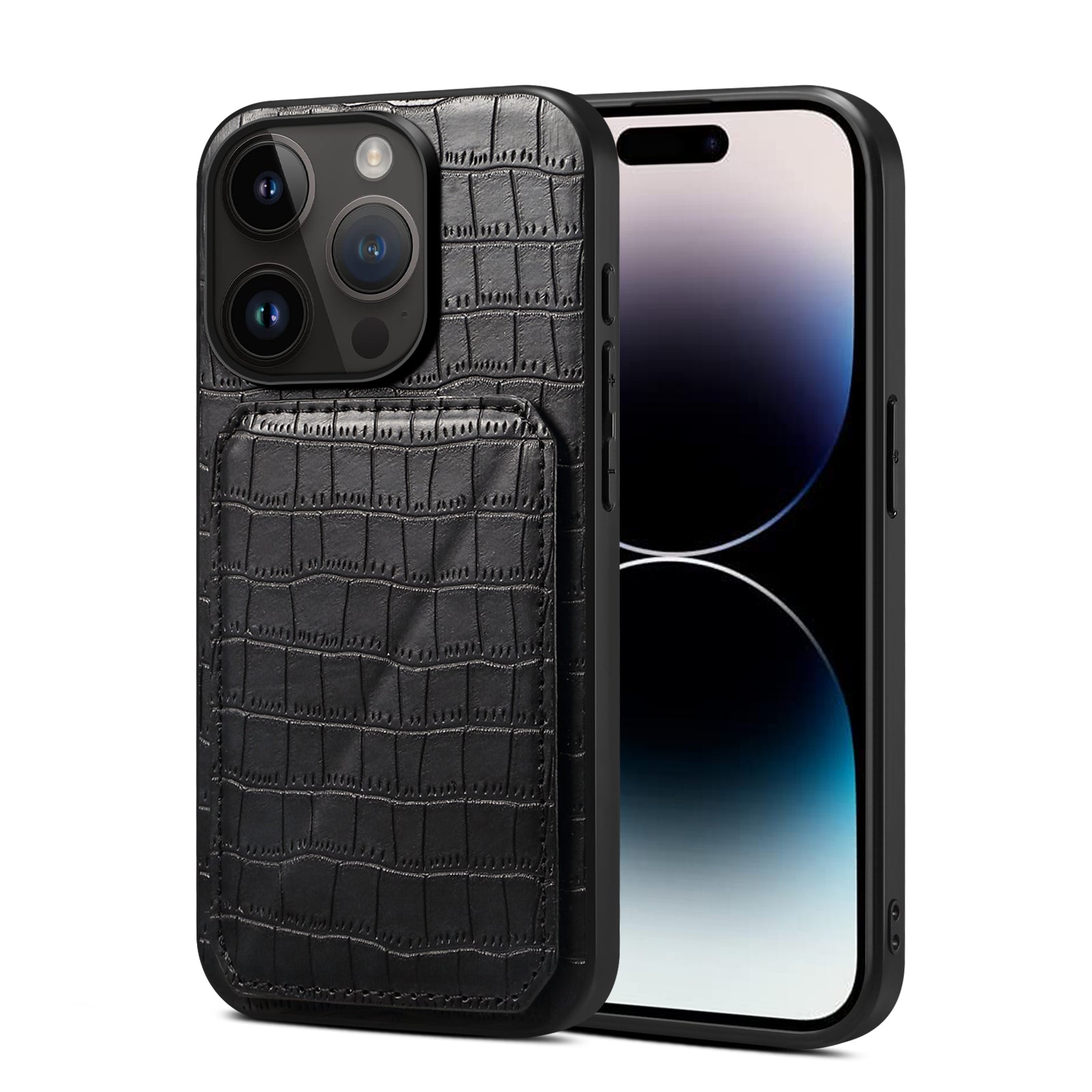 • Sleek crocodile-embossed leather with a built-in card holder for on-the-go convenience.