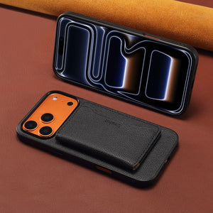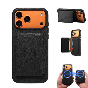 Elegant black leather case featuring MagSafe, convenient card storage, impact resistance, refined design, and versatile daily use for iPhone 12–17.