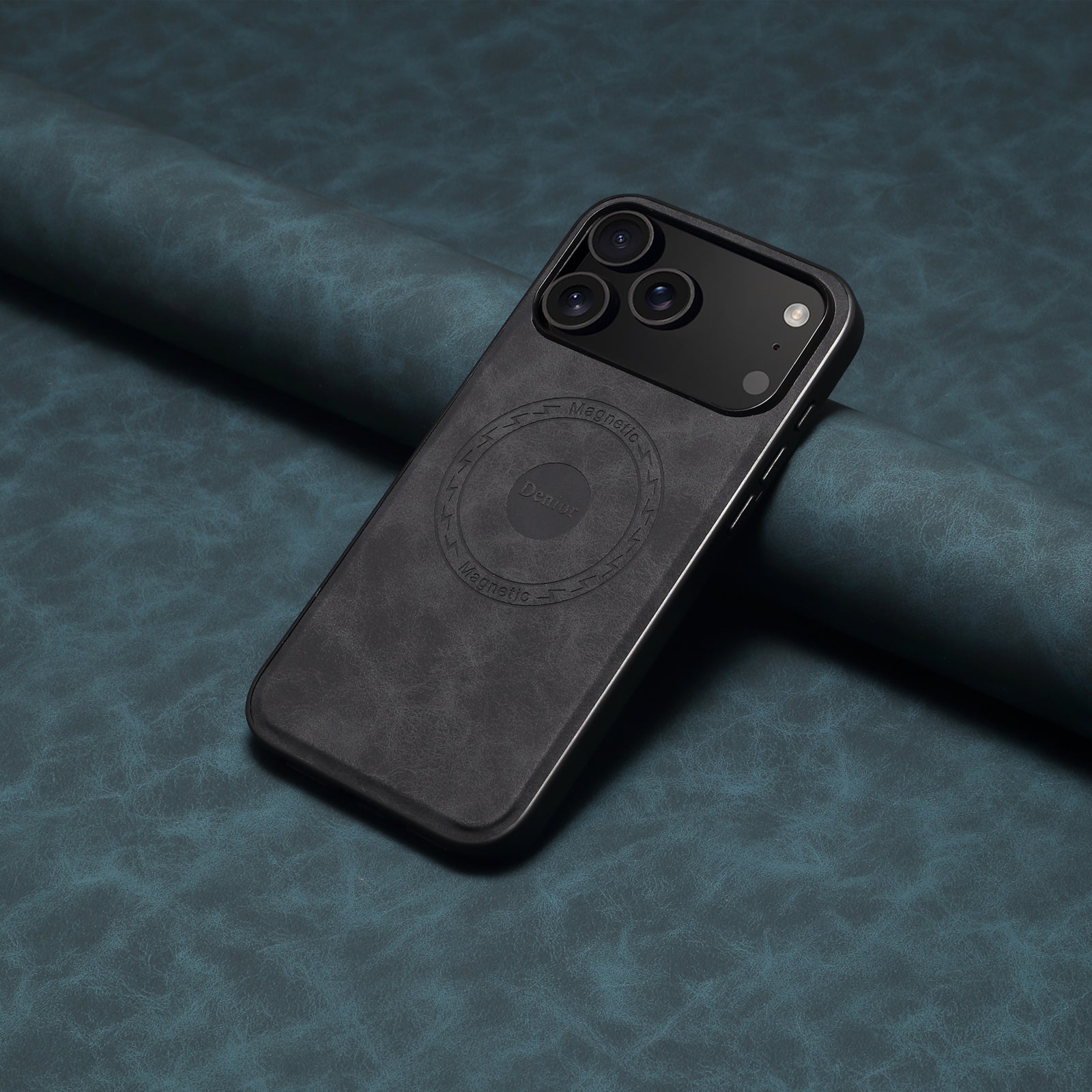 Dark gray matte leather with premium texture, embossed magnetic pattern for understated style. Flexible frame, snug fit, precise camera coverage, scratch-resistant, luxury & protective for daily use.